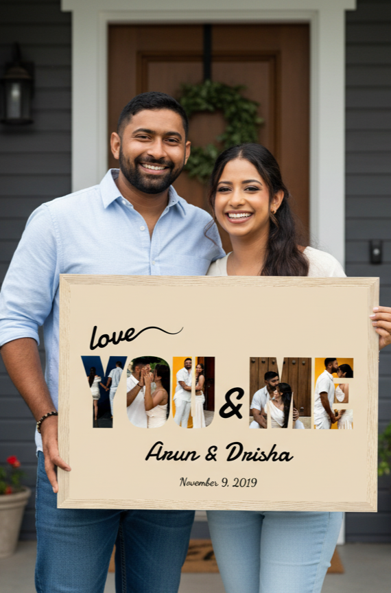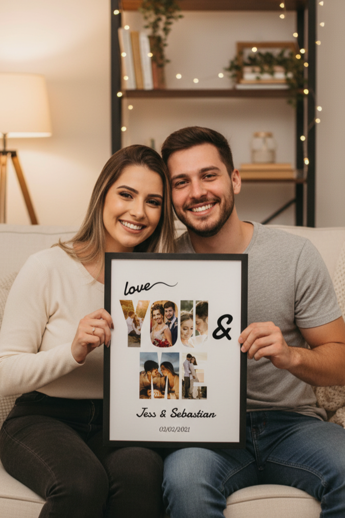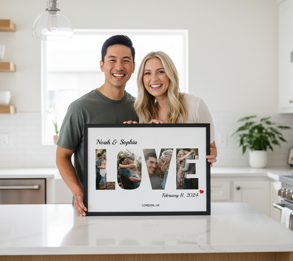 "This framed poster is everything we hoped for and more! As a couple, we wanted something unique and this captures our memories beautifully. The pictures inside the letters look so crisp, and the wood frame adds the perfect premium touch!"